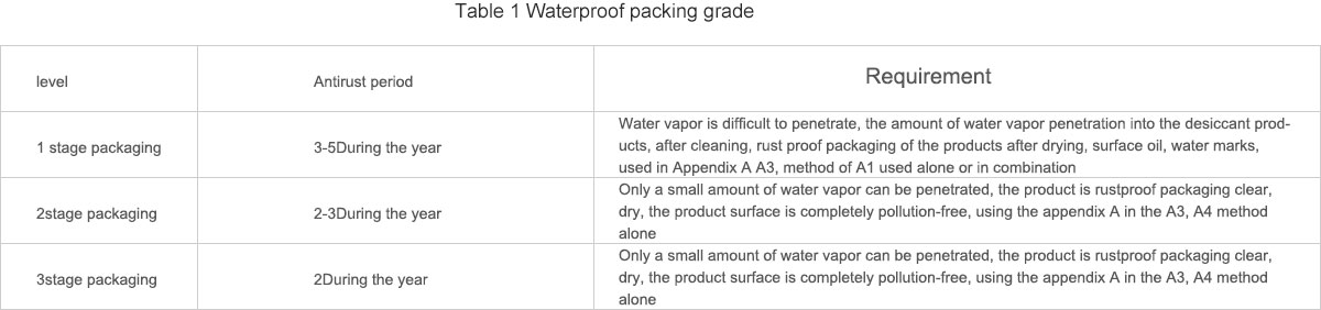 The packaging of rust should be graded according to the corrosion resistance of products, circulation environment, packaging structure, packaging materials and other factors to determine the general performance, rust proof packaging grade is divided into 1 levels: Level 2, 3 packaging, packaging packaging is shown in Table 1,