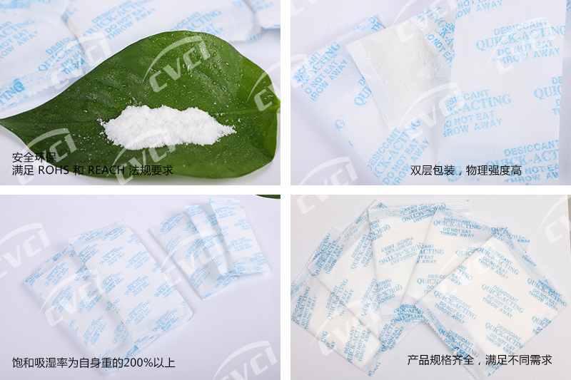 速效干燥劑是以高效活性吸附物為原料,經(jīng)精確計(jì)算,科學(xué)調(diào)配后組成。包裝采用杜邦紙與高級(jí)無紡布雙層包裝,印刷精美,使用方便。該產(chǎn)品規(guī)格齊全,可滿足不同產(chǎn)品的防潮、防銹包裝需求。